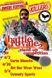 8 p.m., Monday, April 2, Battle Royal, at Carte Blanche Studios, 1024 S. 5th St. See 15 standup comics compete in the first of three preliminary bouts with winners eventually vying for a featured spot in the 7th annual Milwaukee Comedy Festival, Aug. 3-11. Sponsored by Caste of Killers Comedy Collective and Milwaukee Comedy.