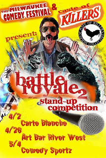 Well then you’ve got the Stand Up Comedy BATTLE ROYAL! Brought to you by Milwaukee Comedy and the Caste of Killers, winners of the contest earn a top spot in this years Milwaukee Comedy Festival and the Standup Comedy Showcase! Sign ups have closed, but the laughs are coming out starting Monday, April 2 at the Carte Blanche Studios in Walkers Point. Each round features contestants who will perform stand-up with judges and audience choice, so see you at the show!