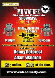 Join them Friday, April 6, at 8:30 p.m. and again at 10:45 p.m. for the Milwaukee Stand-Up Comedy Showcase 10, at Karma Bar & Grill, 600 E. Ogden Ave. Tickets are $5 in advance online or $10 at the door.