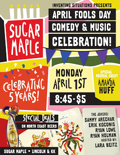 From Facebook: “This is going to be a great night so get down there and help celebrate Sugar Maple’s 5 year Anniversary as well as support local comedy and music. All while enjoying special deals from North Coast Brewery!!!”