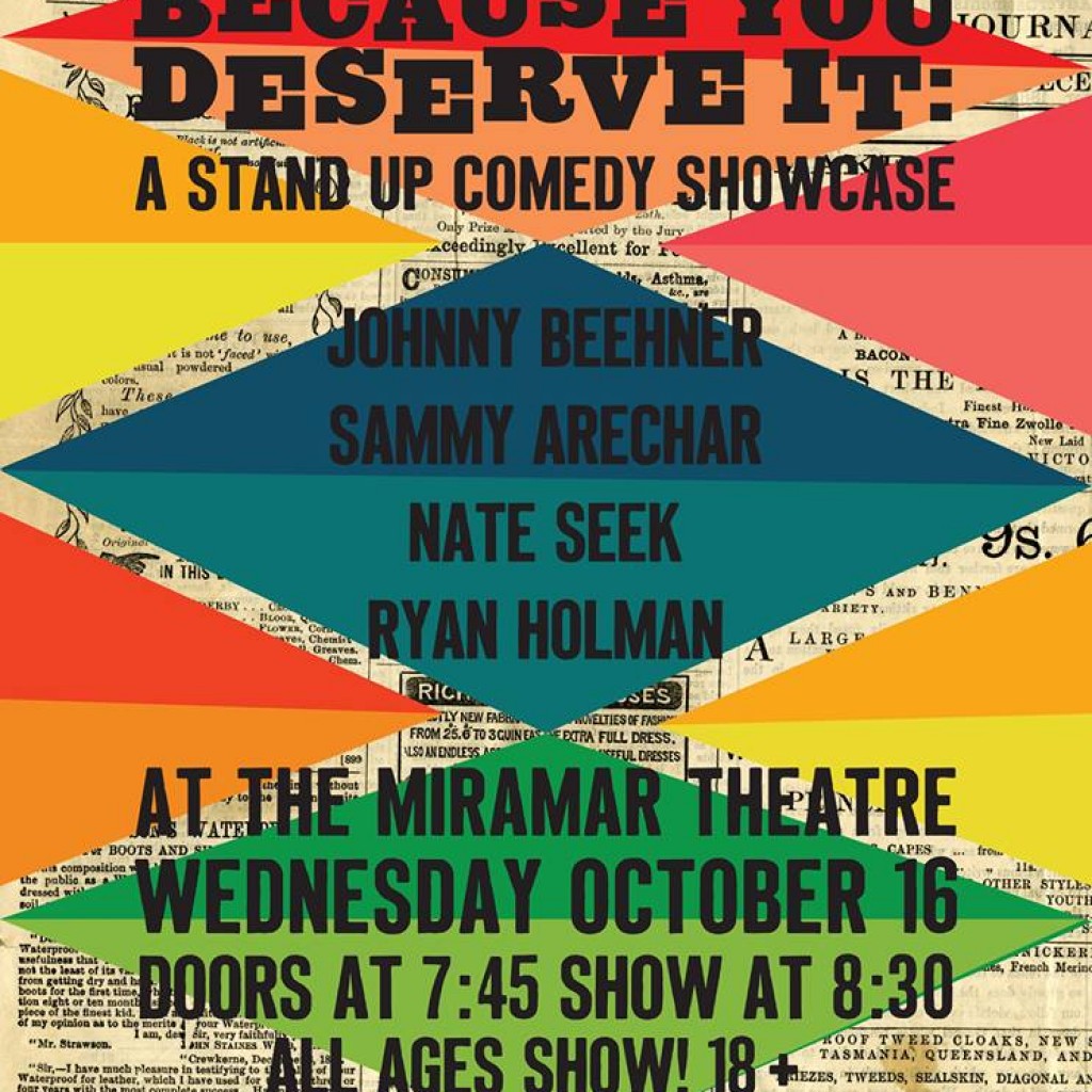 From Facebook: “Because You Deserve It, is a new stand up comedy showcase at The Miramar Theatre that plans to bring you a new crew of high quality, up and coming, comics from near & far each month.”
