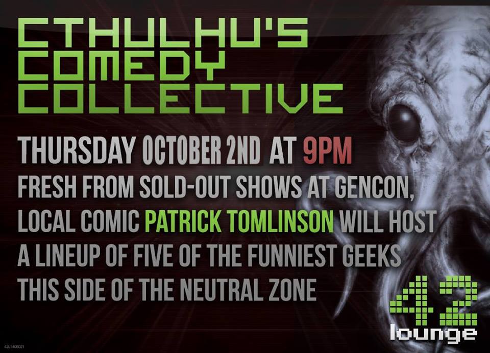 nights, Oct. 2nd brings another Cthulhu’s Comedy Collective at 42 Lounge (326 E Mason St., Milwaukee). There is an all-star line up: comedians Patrick Tomlinson, Mark Roth, Suze Bischoff, Mr. J.J., Alan Talaga and Tyler Menz.